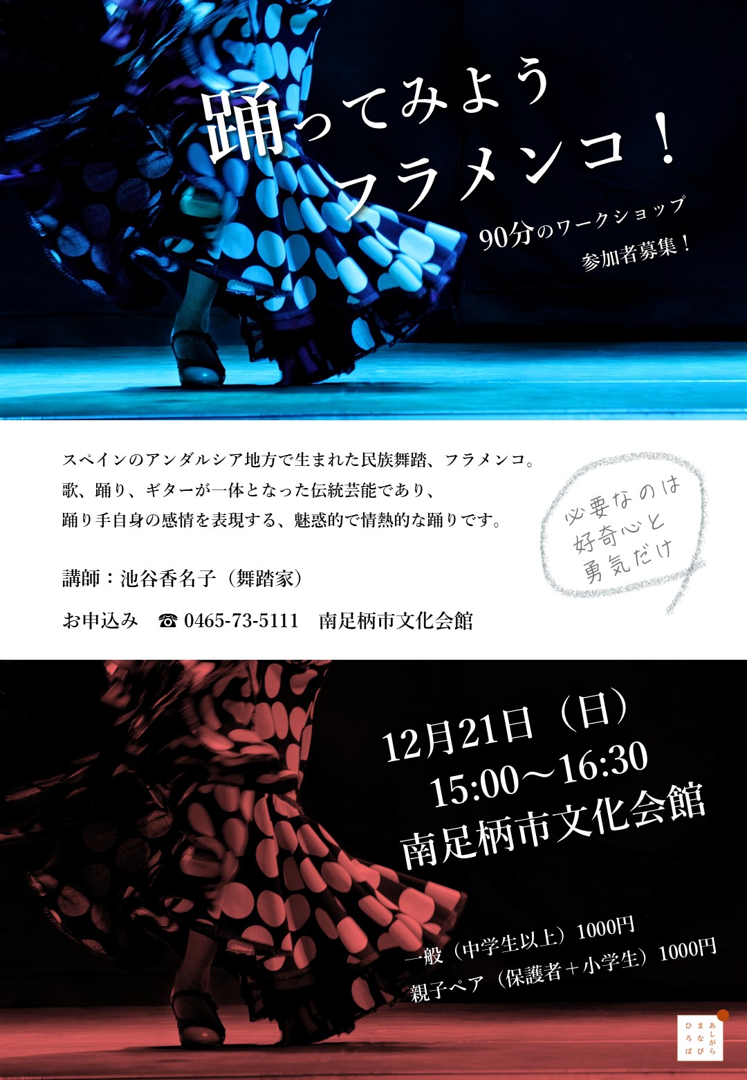 【日にち】12月21日(日)【時間】15:00~16:30【会場】南足柄市文化会館 【参加費】一般(中学生以上)1,000円、親子ペア(保護者+小学生)1,000円【講師】池谷香名子(舞踏家)